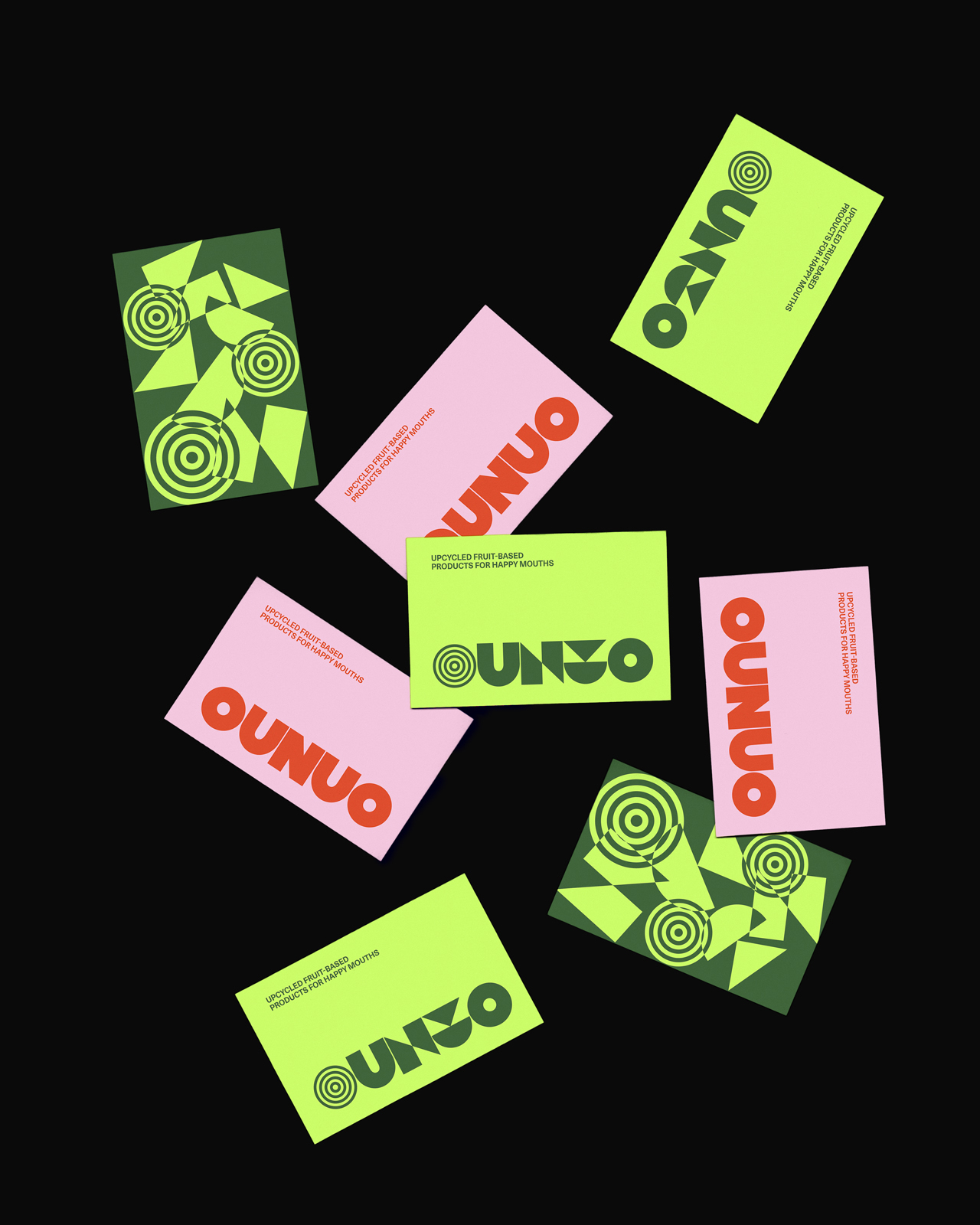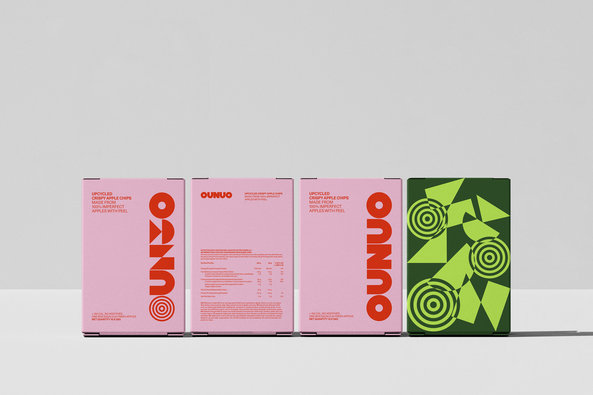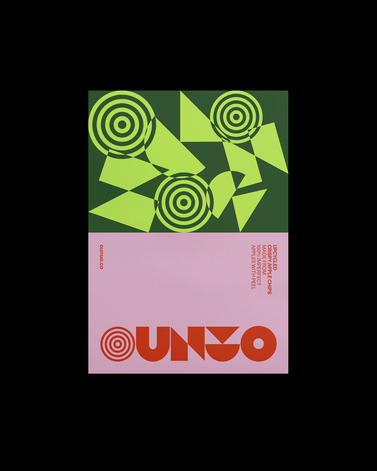 Para su identidad se propone una solución modular, con la composición tipográfica como eje central y principal vehículo de comunicación de la marca. Un logotipo modular a medida, construida a partir de formas geométricas simples. Cada glifo (O, U, N) cuenta con cinco variables y toma como referencia el lenguaje de superposición de elementos y la relación entre figura y fondo para desarrollar una gráfica dinámica y heterogénea. La paleta cromática toma como referencia distintas variedades de manzana. El resultado es una identidad visual dinámica y alegre, con un sistema gráfico abierto, pensado para acompañar el crecimiento de la marca y su catálogo de productos.